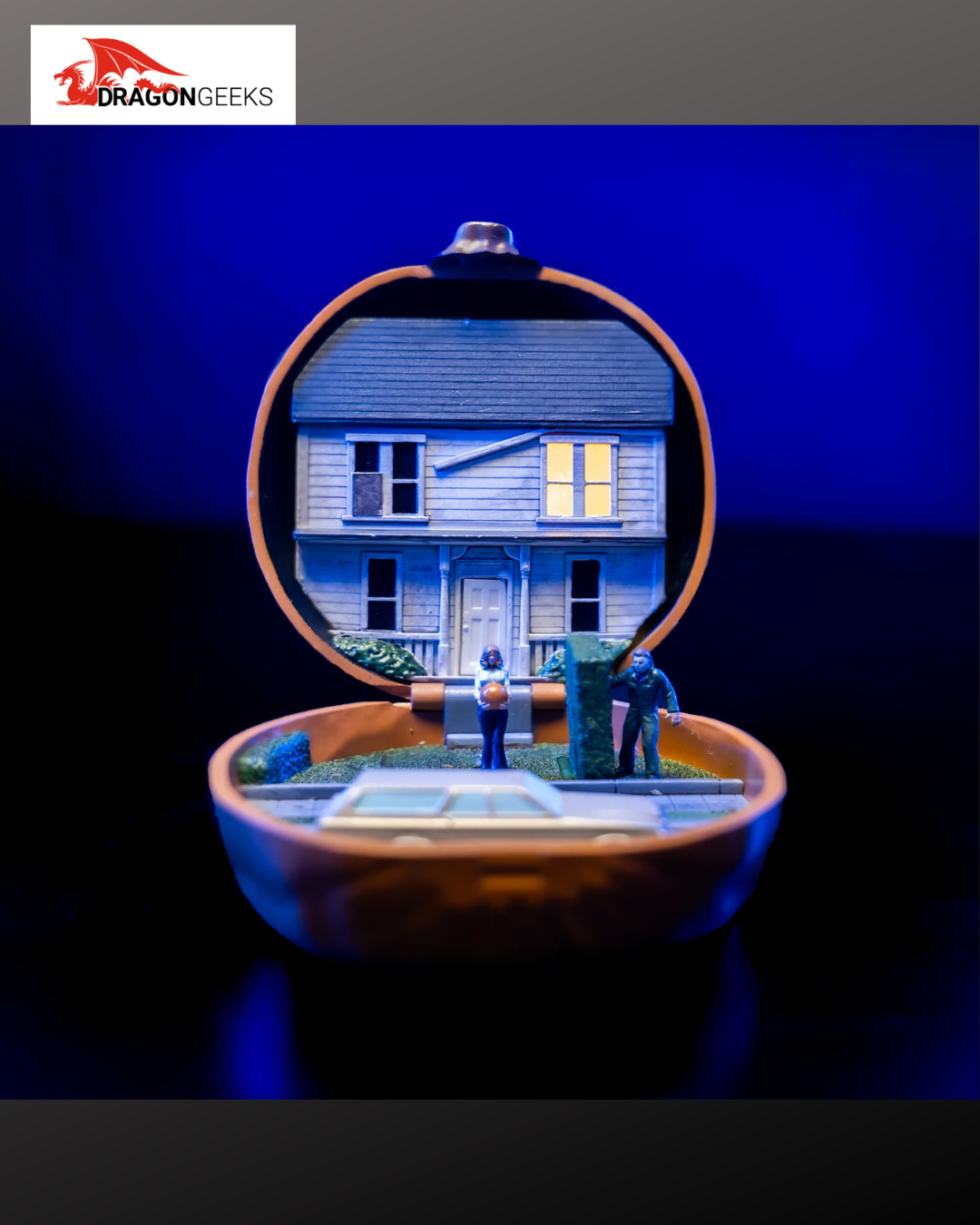 The pumpkin hinges open to reveal a detailed micro-scale play environment featuring the Myers House, complete with a working hinged door and hinged hedge for movie-inspired stalking scenes. A built-in light-up feature adds atmospheric display value.