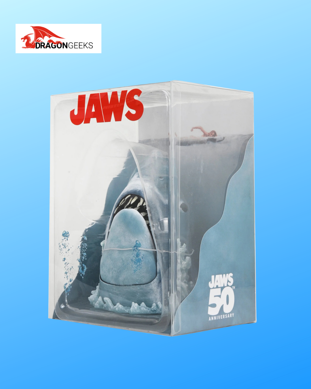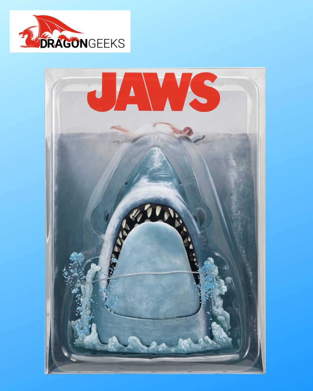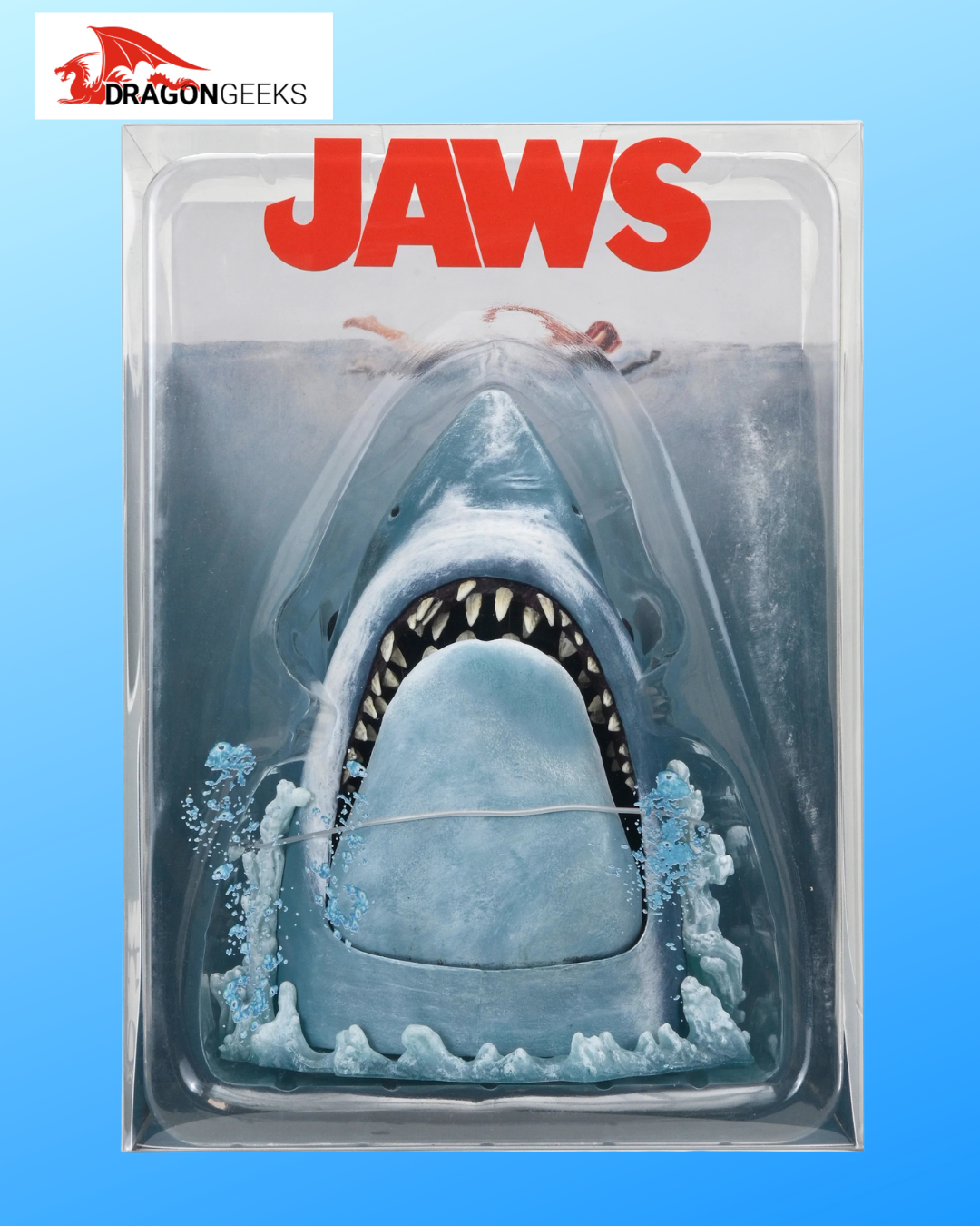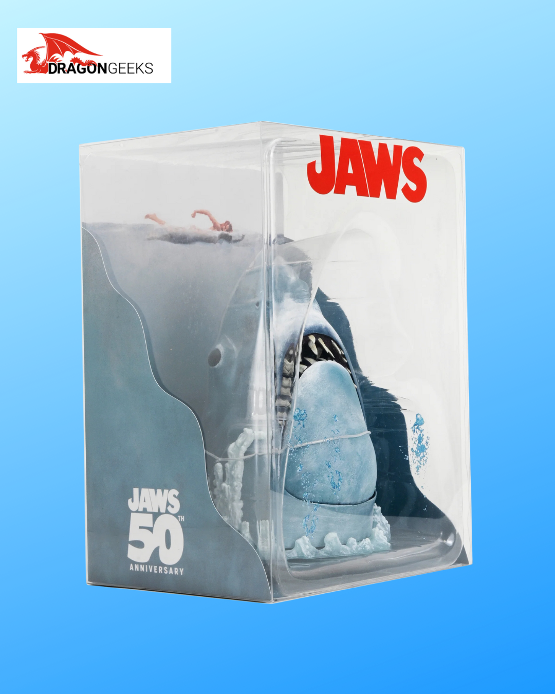 Celebrate 50 years of Jaws! Considered one of the greatest achievements in film, the classic 1975 Steven Spielberg thriller paved the way for what would become the summer blockbuster. In honor of its anniversary, NECA is bringing the movie's legendary poster artwork to life as a collectible display piece. Sculpted and painted to replicate the intricate detail of the mako shark from Roger Kastel’s original iconic painting, this menacing figure features an articulated jaw and sits atop a stylized water base with sculpted bubbles. Designed to look like a three-dimensional version of the poster, the shark comes in a clear window box with a backdrop insert that recreates the classic poster. It’s a must-have tribute piece for Jaws fans!