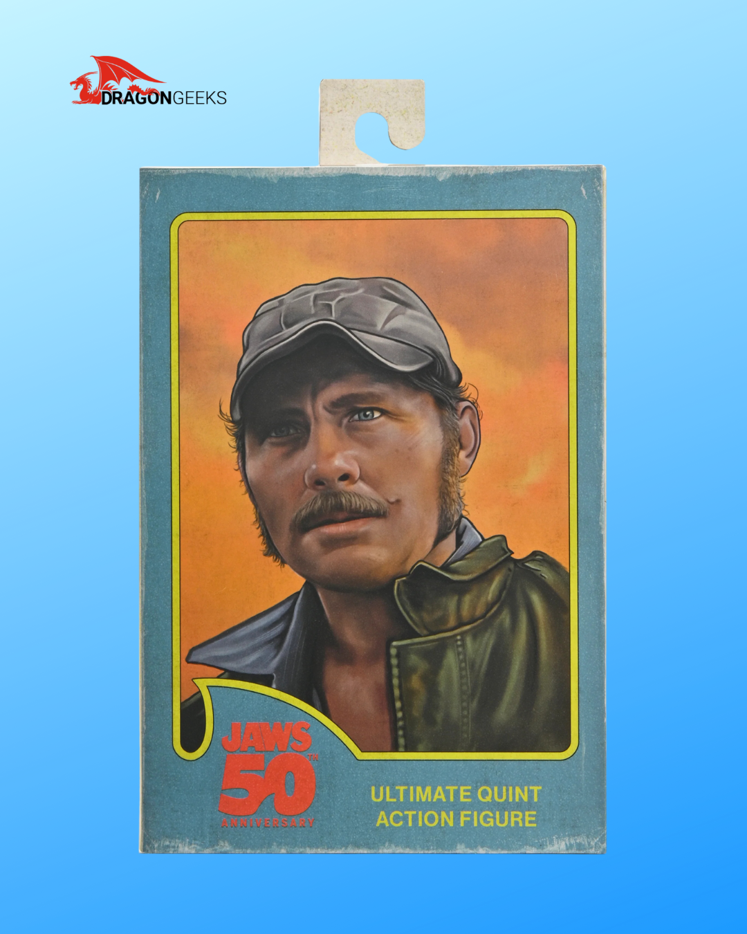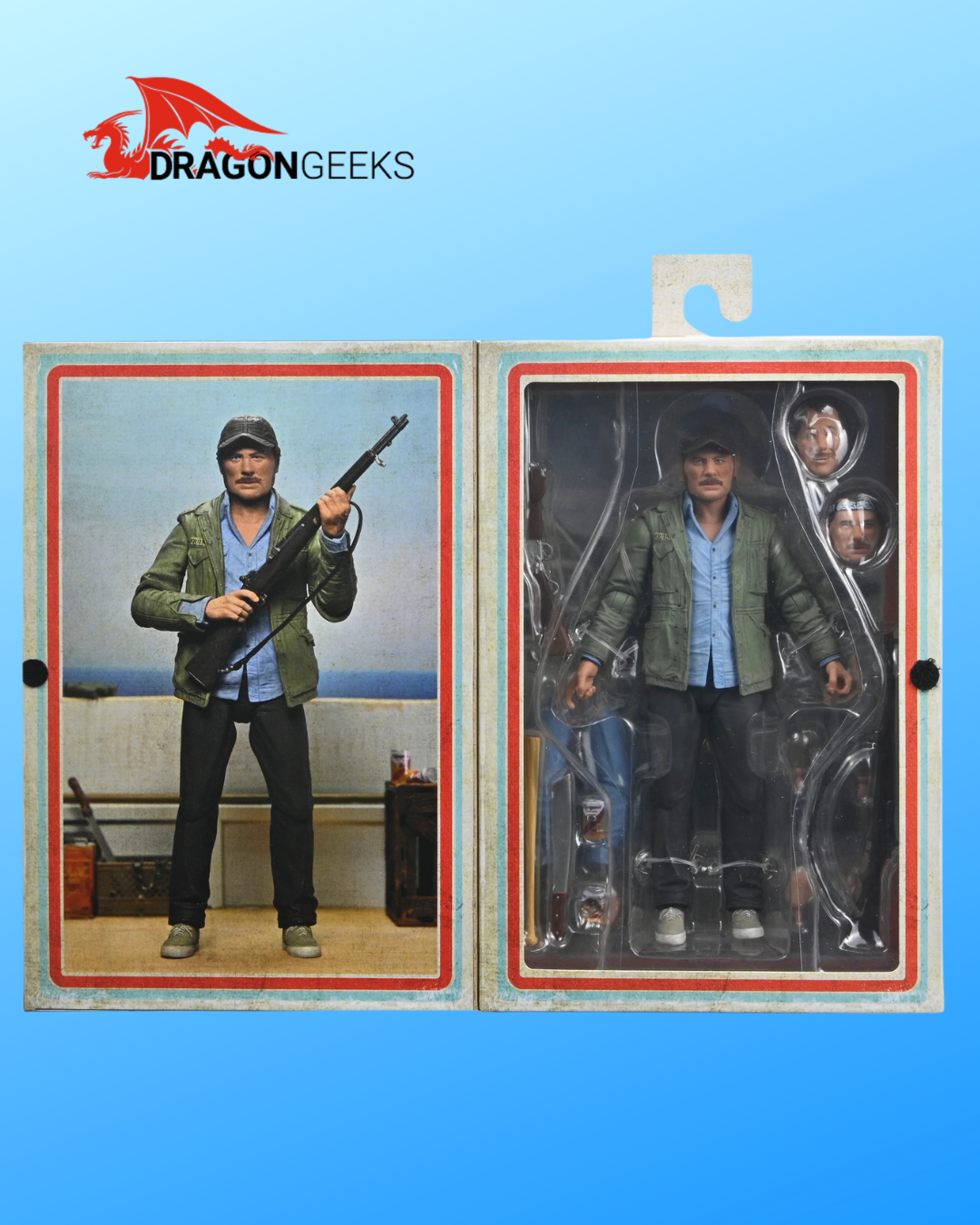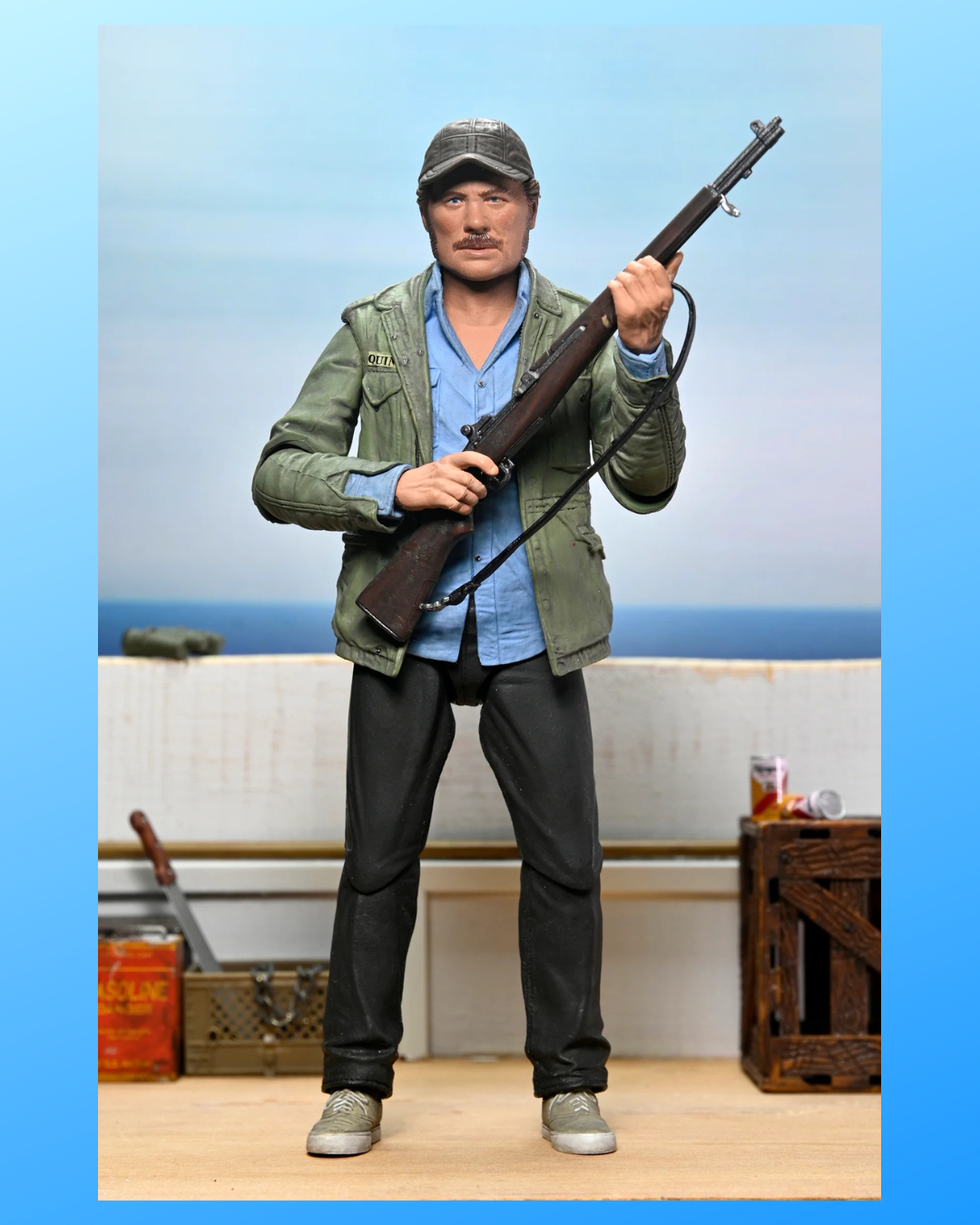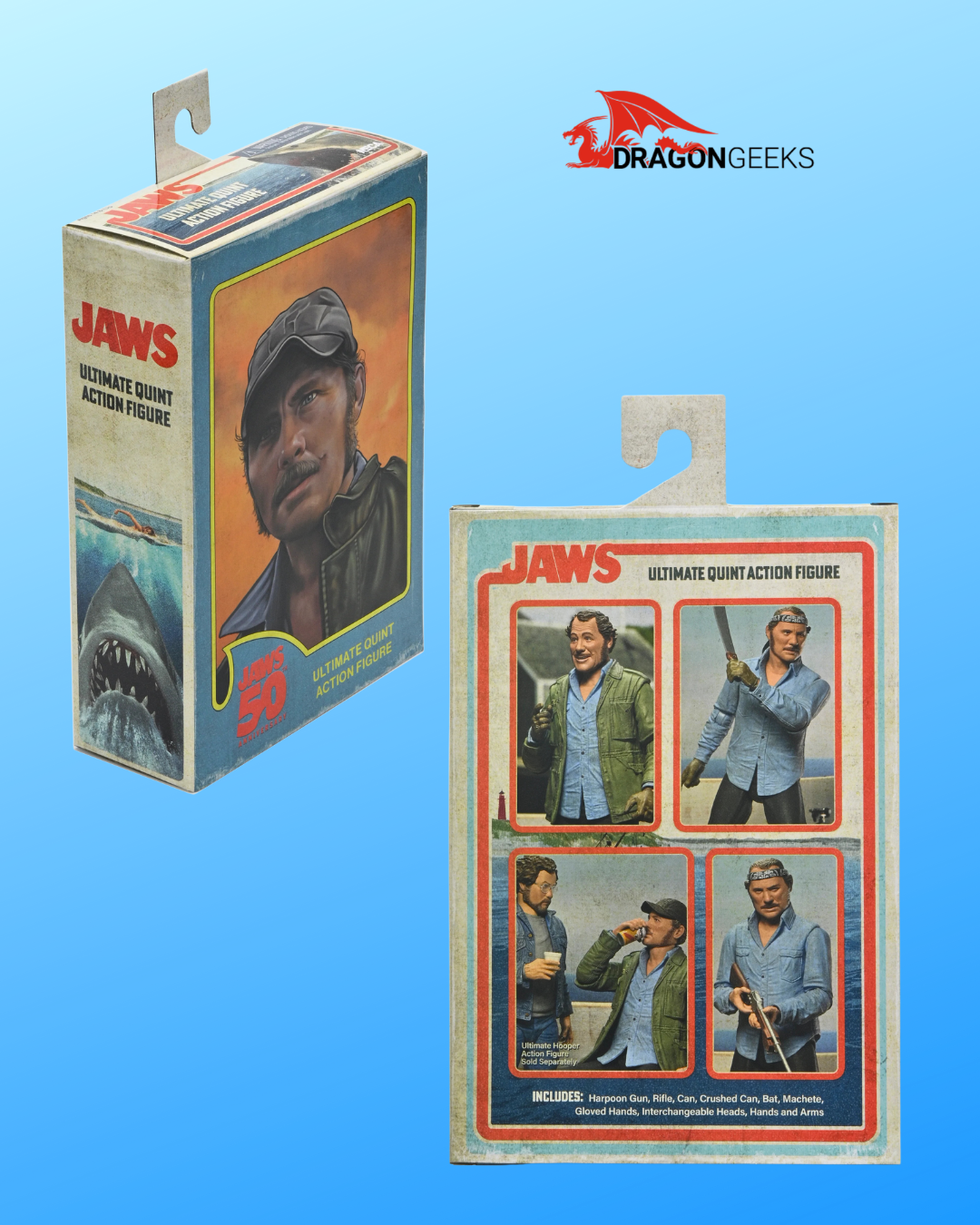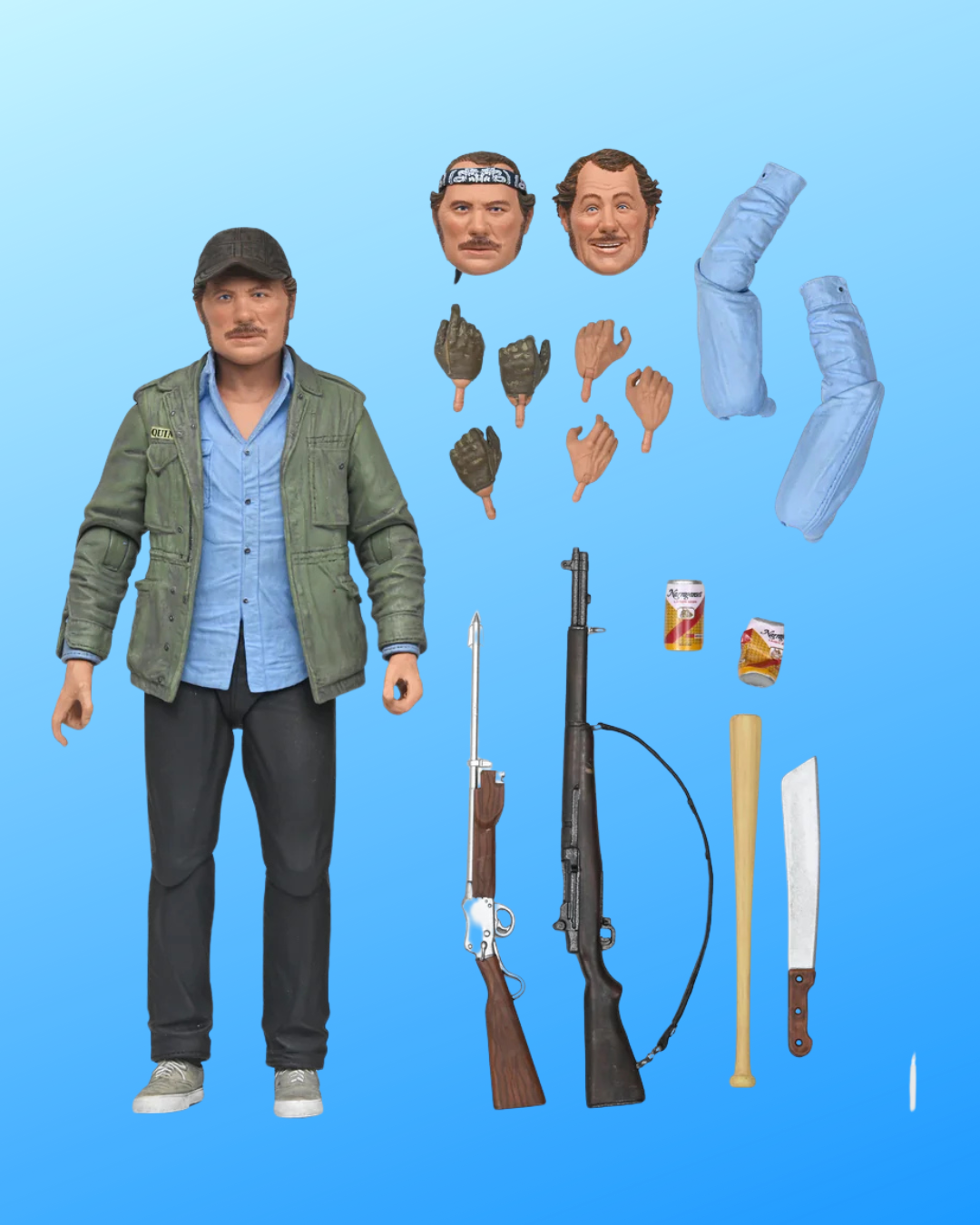 Celebrate 50 years of Jaws with NECA! Considered one of the greatest achievements in film, the classic 1975 Steven Spielberg thriller paved the way for what would become the summer blockbuster. The iconic character Sam Quint is now available as an Ultimate action figure. The headstrong captain of the Orca hunts the shark until his hubris leads to his bloody demise. Standing in 7-inch scale, the figure includes multiple interchangeable heads, hands, and arms for an alternate look. Plus, gloved hands, machete, can, crushed can, rifle, and harpoon gun. Comes in collector-friendly window box packaging with opening front flap.